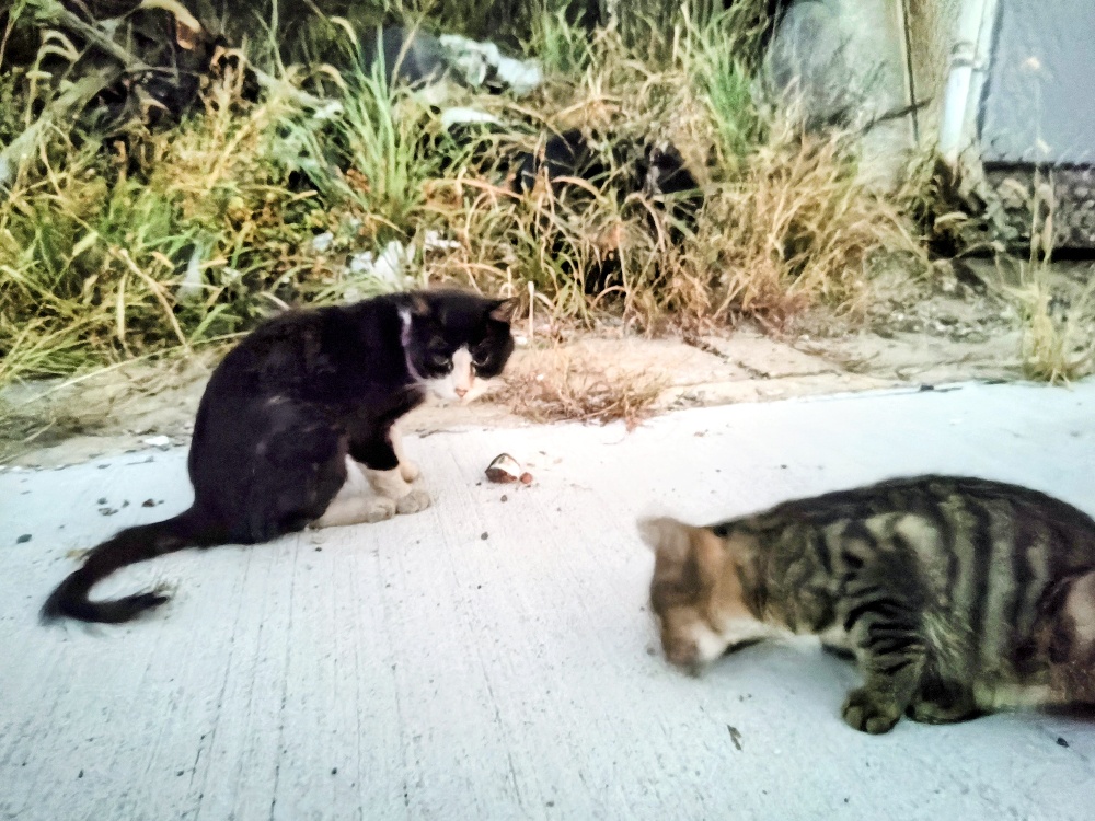 暇で辺りを見ていたらネコが2匹近くにいたので、サバの切り身をあげたら、ぺろりと平らげた。