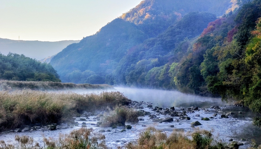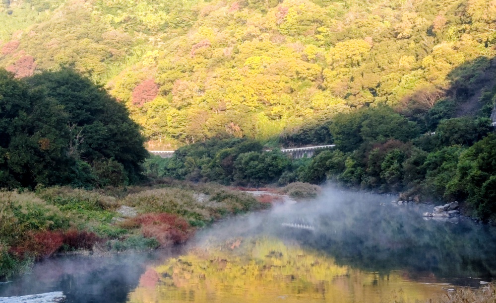川の暖かい水面から蒸発した水蒸気が、冷たい空気にふれ、凝結してできる霧で、川の水温が高く気温が低い晩秋や初冬の頃によく発生するそうだ。
