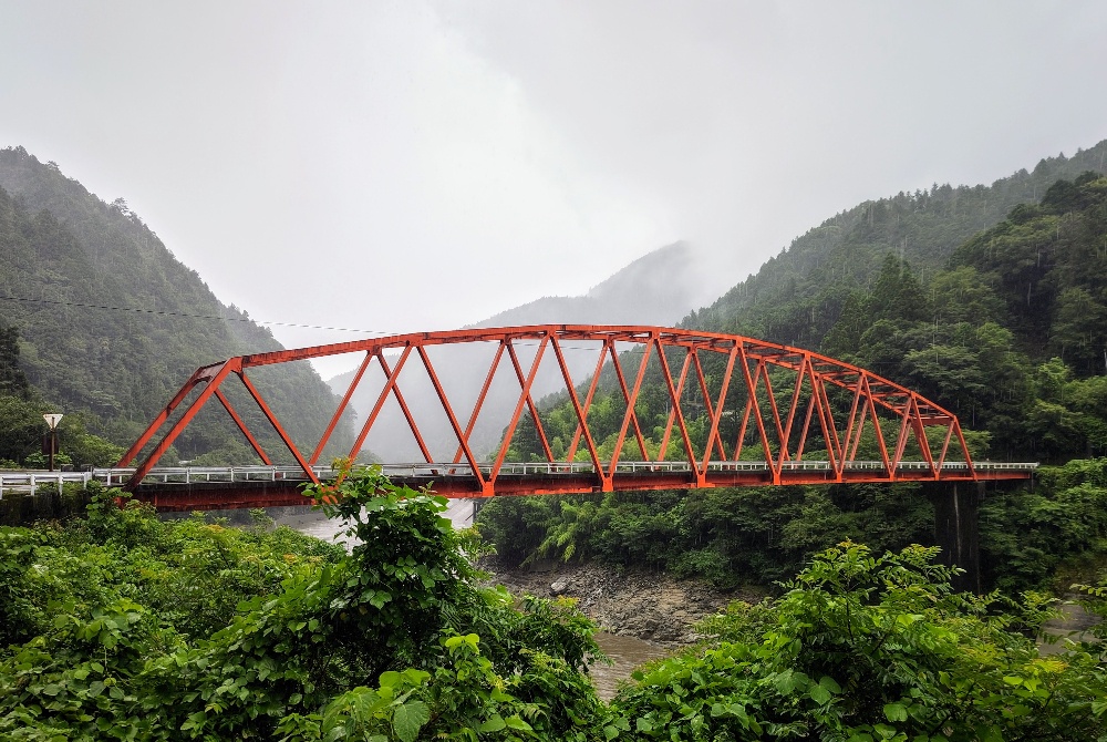 遠目だとなかなか映える赤いトラス橋。早明浦ダムの影響で、吉野川の川幅は少しづつ広くなる。