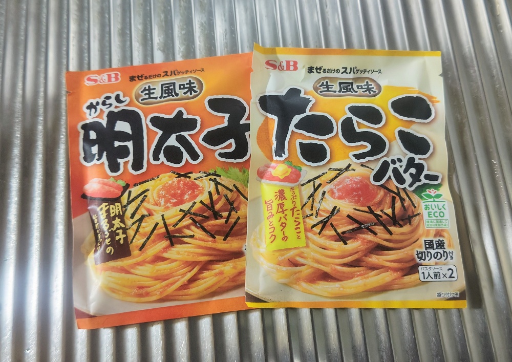 S&Bタラスパソースは2人前なので、2つでピッタリ!今回は明太子とタラコ。しかも麺が短いので、フライパンで茹でることができる。