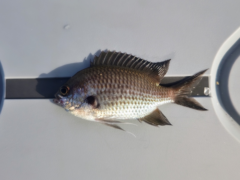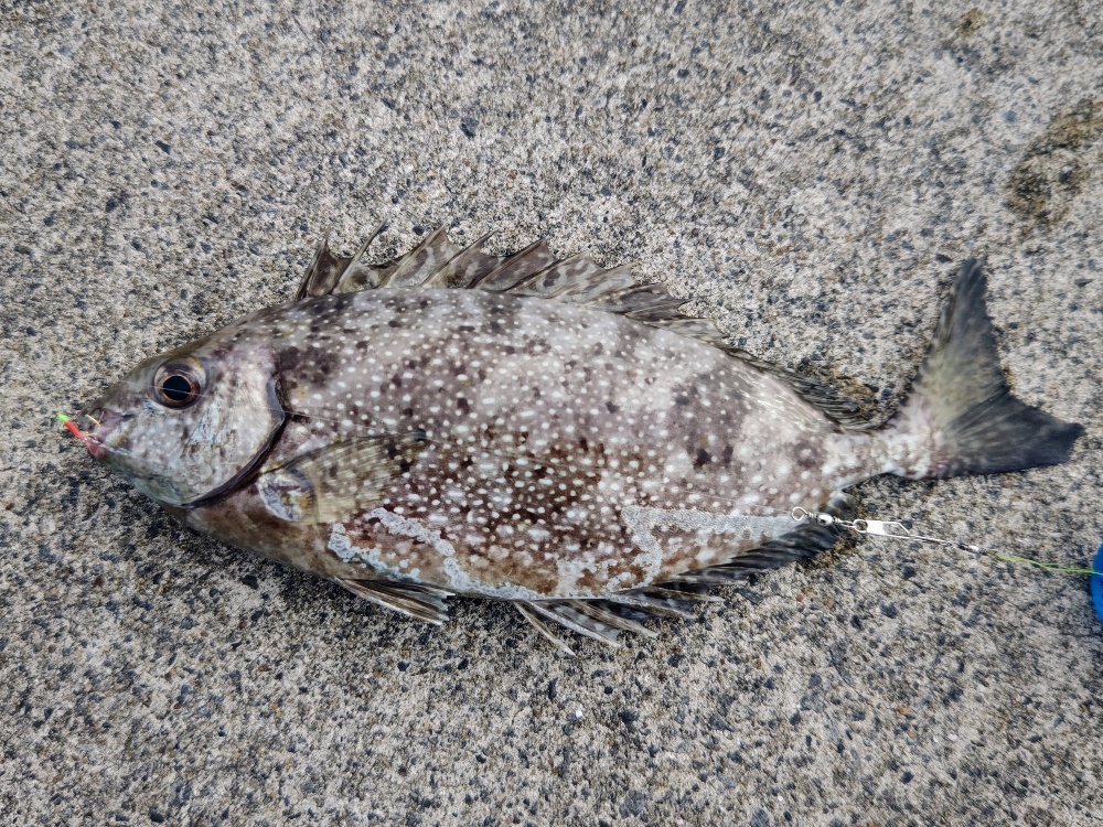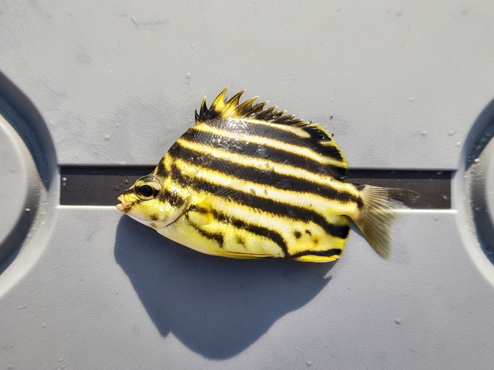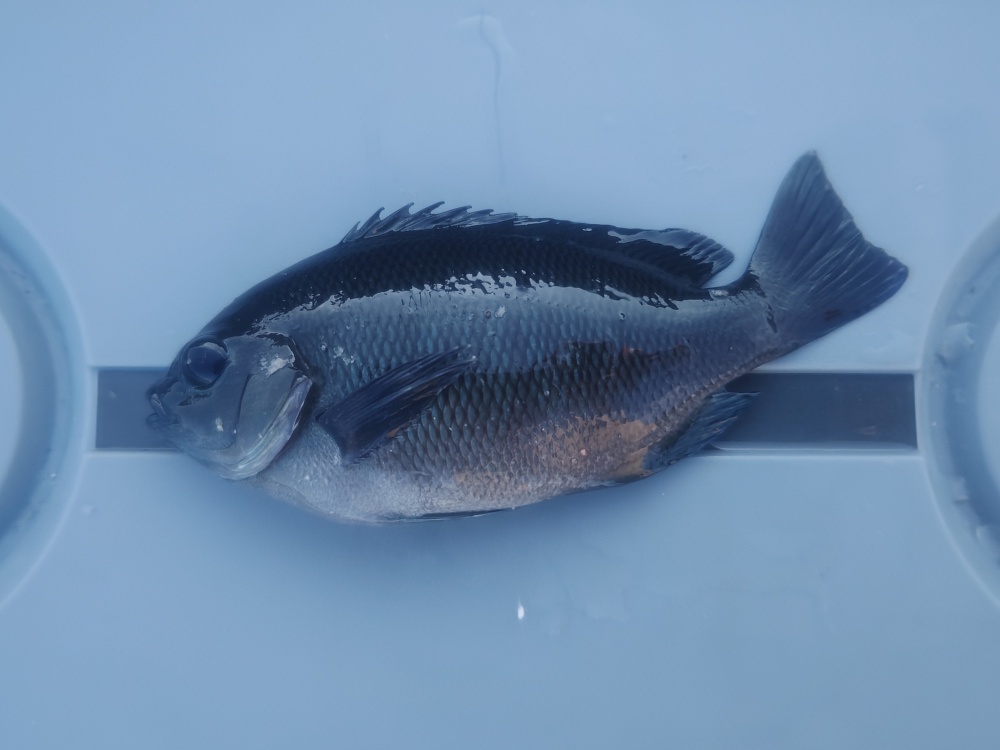 カゴカキダイという魚。初めて釣りました。美味しいらしいが小さかったのでリリースしました。