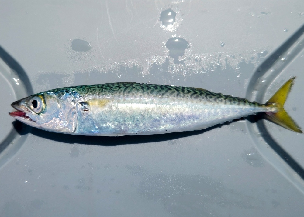 サバです。らしい強い引き。この写真の撮影時に撒き餌をしたら、目の前は魚でウジャウジャに…