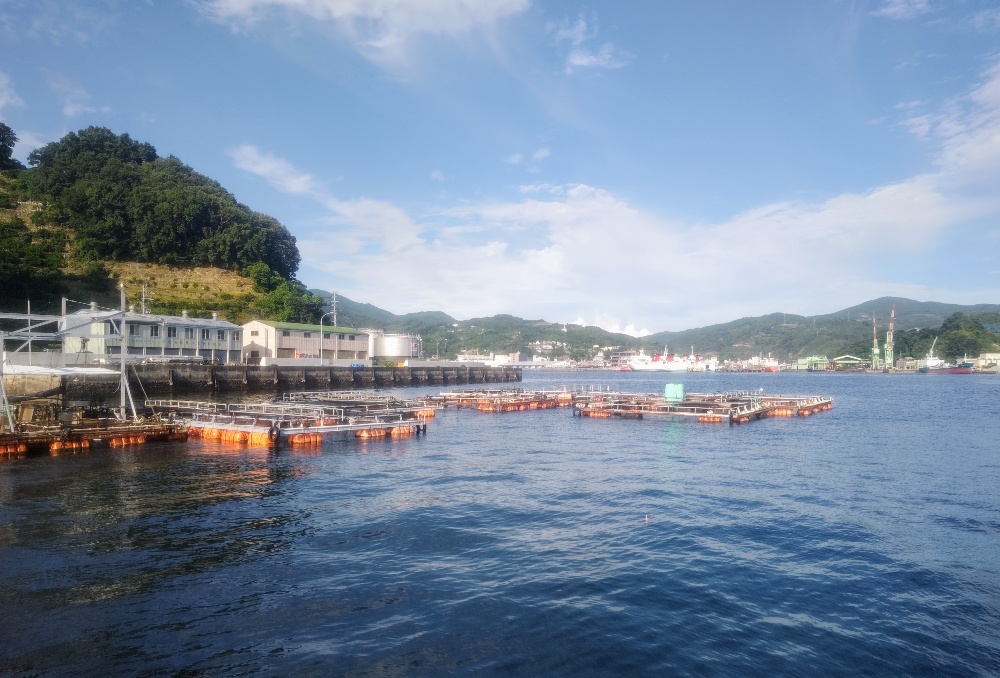 灯台のある八幡浜北側にある防波堤。防波堤の先端と写真の養殖生簀周辺がポイントらしい。